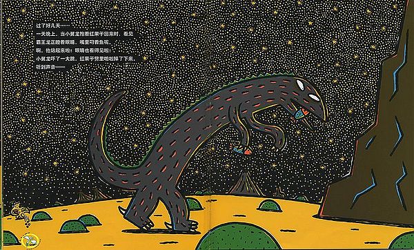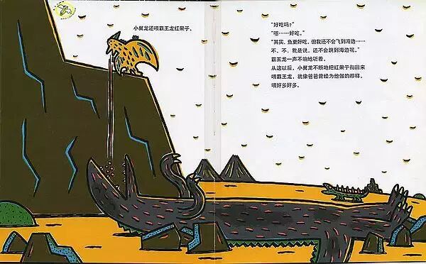 小翼龙还喂霸王龙红果子。“好吃吗?”“恩……好吃。”“其实,鱼更好吃,但我还不会飞到海边……不,不,我是说,还不会跳到海边呢。”霸王龙一声不响地听着。从这以后,小翼龙不断地把红果子衔回来喂霸王龙,就像爸爸曾经为他做的那样,喂好多好多。