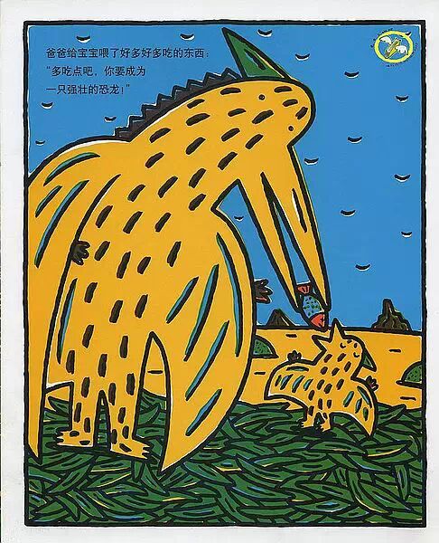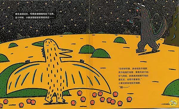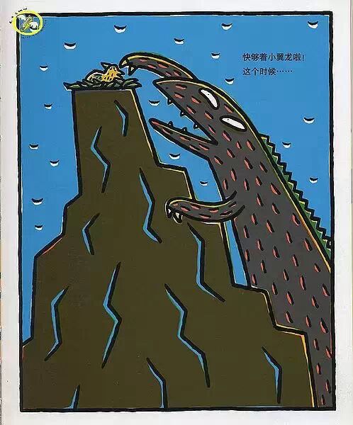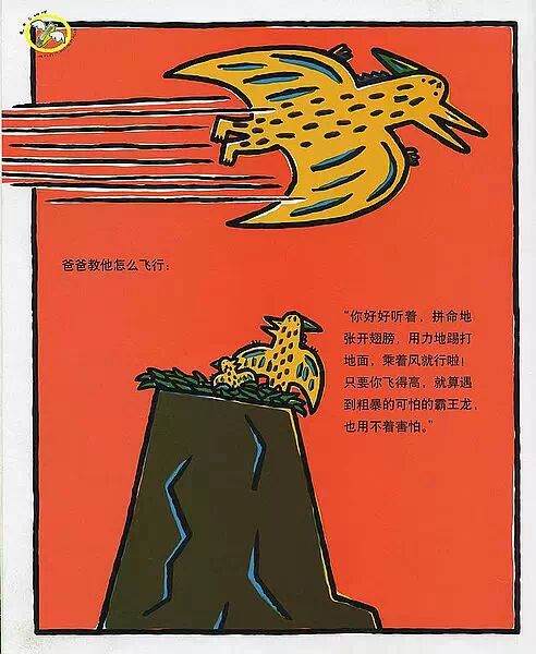 爸爸教他怎么飞行:“你好好听着,拼命的张开翅膀,用力地踢打地面,乘着风就行啦@只要你飞得高,就算遇到粗暴的可怕的霸王龙,也用不着害怕。”
