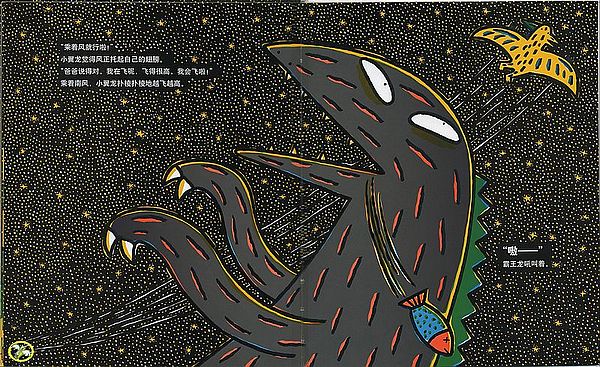 霸王龙回过头,叼着与嘣嘣地走了过来。这个时候,小翼龙想起爸爸曾经说过……“|你好好听着,拼命地张开翅膀,用力地踢打地面,乘着风就行啦!你飞得高,就算遇到粗暴可怕的霸王龙,也用不着害怕。”小翼龙拼命地张开翅膀,“啊……”
