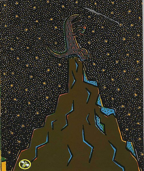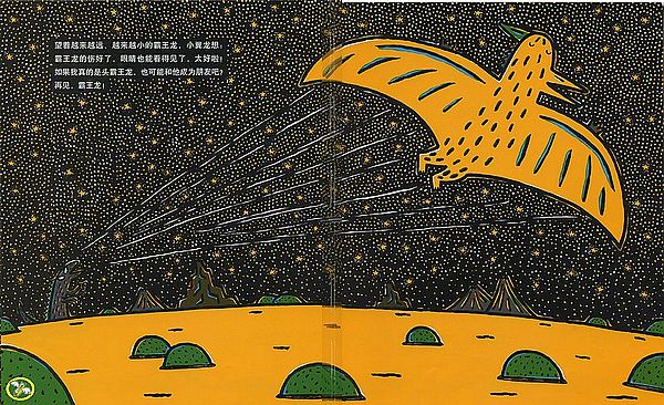 霸王龙不再追赶小翼龙了,他朝着星空小声地说:“我早就知道你是翼龙,……我特地捉来了你最喜欢吃的鱼,想和你一起吃……然后,看着你的脸说声,‘谢谢’。真的,谢谢你啊!”霸王龙一直一直望着小翼龙消失的地方……