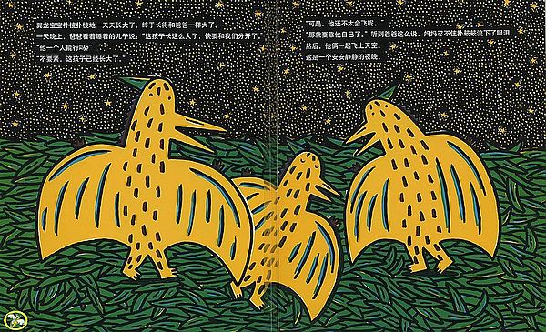 翼龙宝宝一天一天长大,终于长得和爸爸一样大了。一天晚上,爸爸看着睡着的儿子说:“这孩子长这么大了,快要和我们分开了,“他一个人能行么?”“不要紧,这孩子已经长大了。”“可是,他还不太会飞呢。”“那就要靠他自己了。”听到爸爸这么说,妈妈忍不住扑簌簌流下了眼泪。然后,他俩一起飞上天空。这是一个安安静静的夜晚。