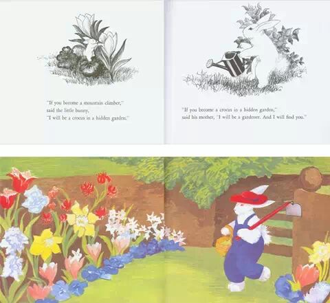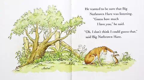 相信这本书大家都比较熟悉。书中通过一大一小两只兔子短短的对话,浓缩生命中最复杂、也是最伟大的情感。小兔子认真地向大兔子表达“我爱你”,并用各种身体动作和看得见的静物表达自己对大兔子的爱。但不管怎么比,永远也比不过大兔子来得多、来得高、来得远。最后,小兔子终于在一片酽酽爱意的包裹下睡去了。