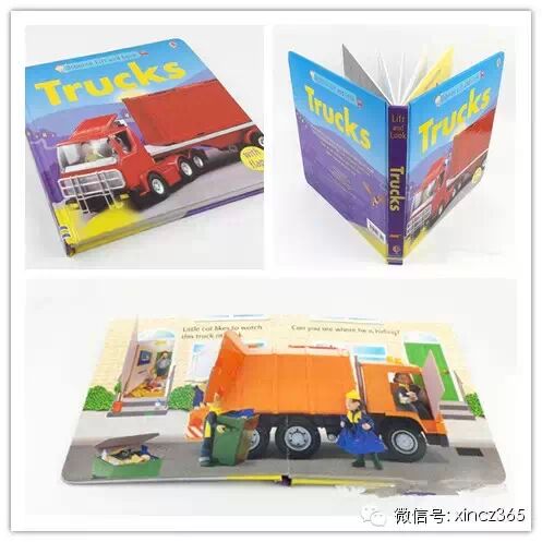 2、《Truks》内容简介:usborne大本翻翻,小朋友的最爱。全书围绕一只喜欢卡车得小黑猫藏身在卡车的各个地方,引导小朋友去发现。立体感很强,而且色彩很鲜艳。