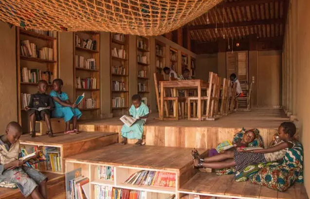 即使在非洲刚果,孩子们也有自己的图书馆,全部用原木搭造,很原生态。