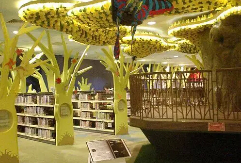 新加坡中央公共图书馆中的少儿馆图书陈列区,热带雨林风格的。